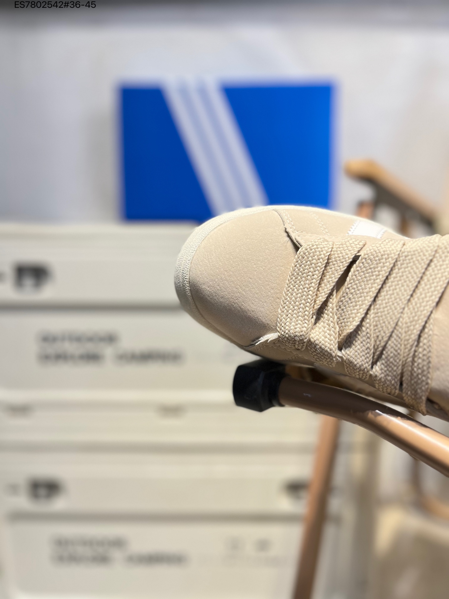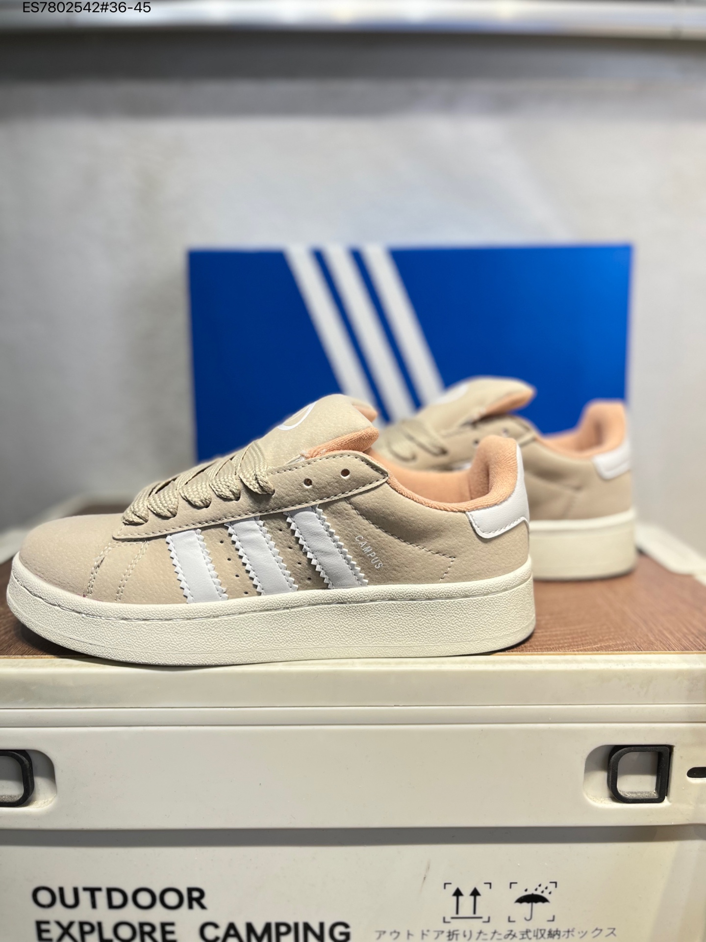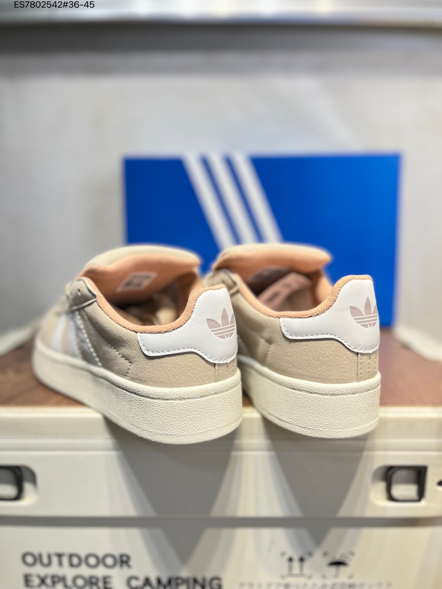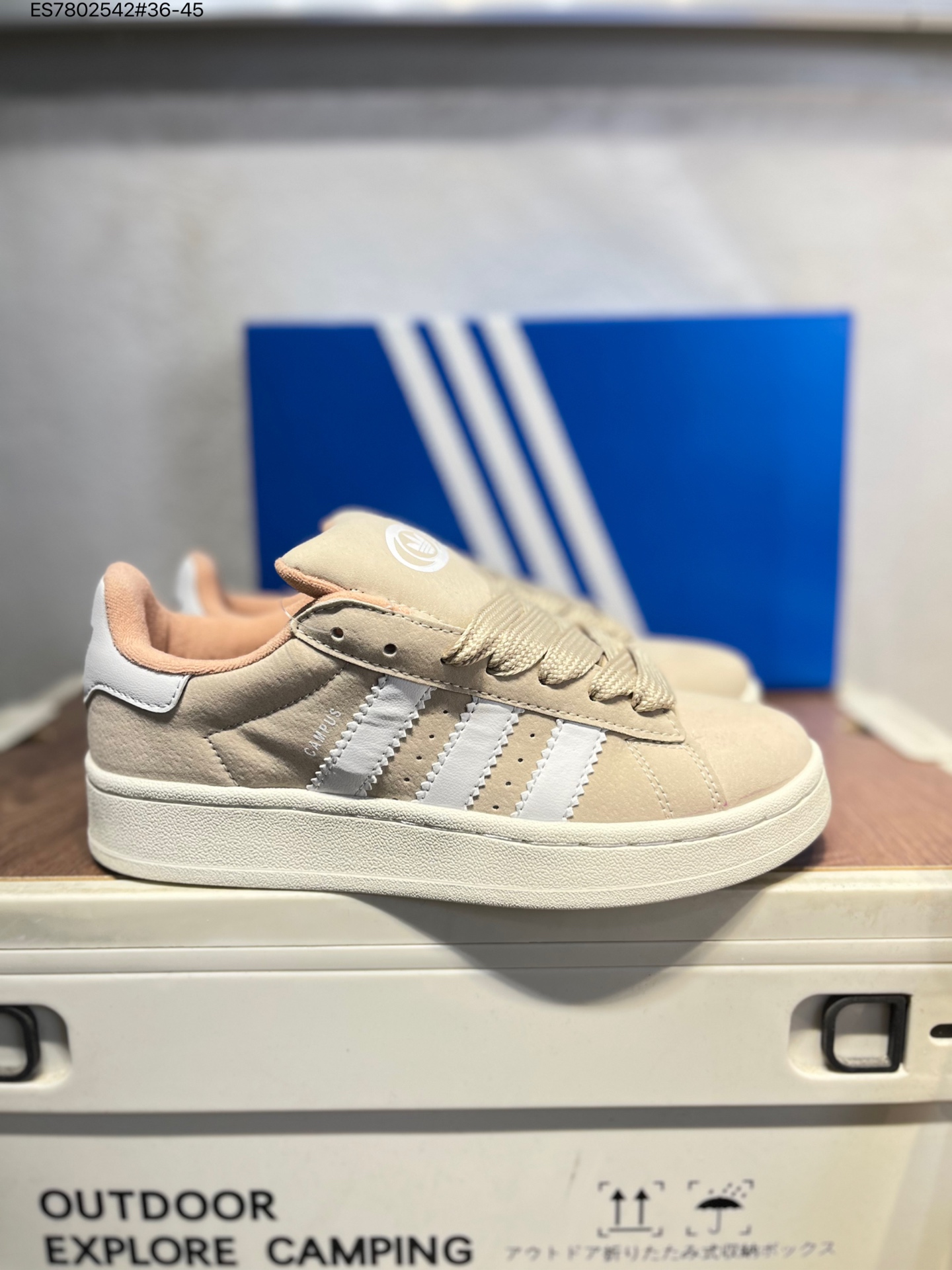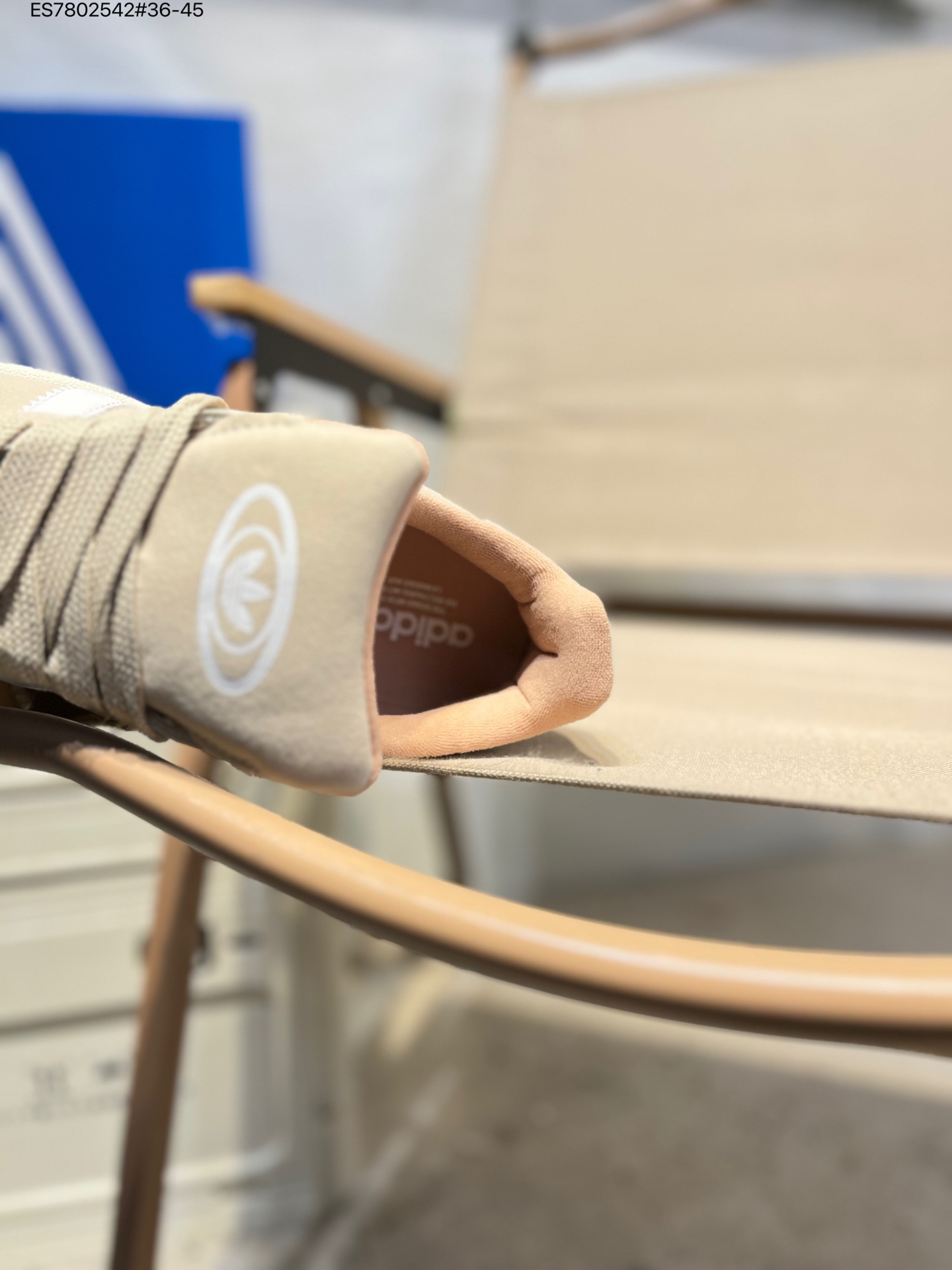 - 標誌性輪廓與細節:這款鞋復刻了 Campus 系列經典低幫輪廓,並融入千禧年滑板鞋的飽滿設計,鞋身圓潤飽滿,完美契合 “麵包鞋” 的視覺特徵。鞋身側面是辨識度極高的鋸齒狀三條紋,鞋舌和鞋跟處分別點綴三葉草標誌,既呼應系列經典元素,又強化了品牌辨識度,整體復古氛圍拉滿。