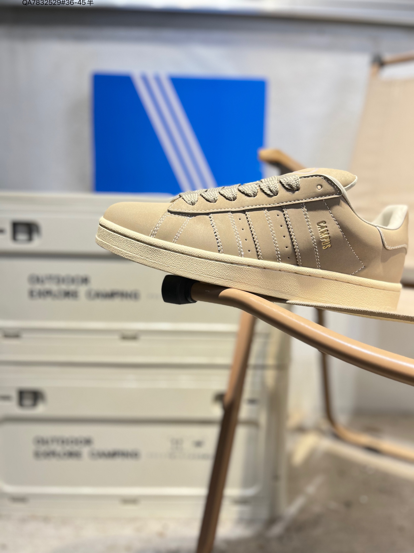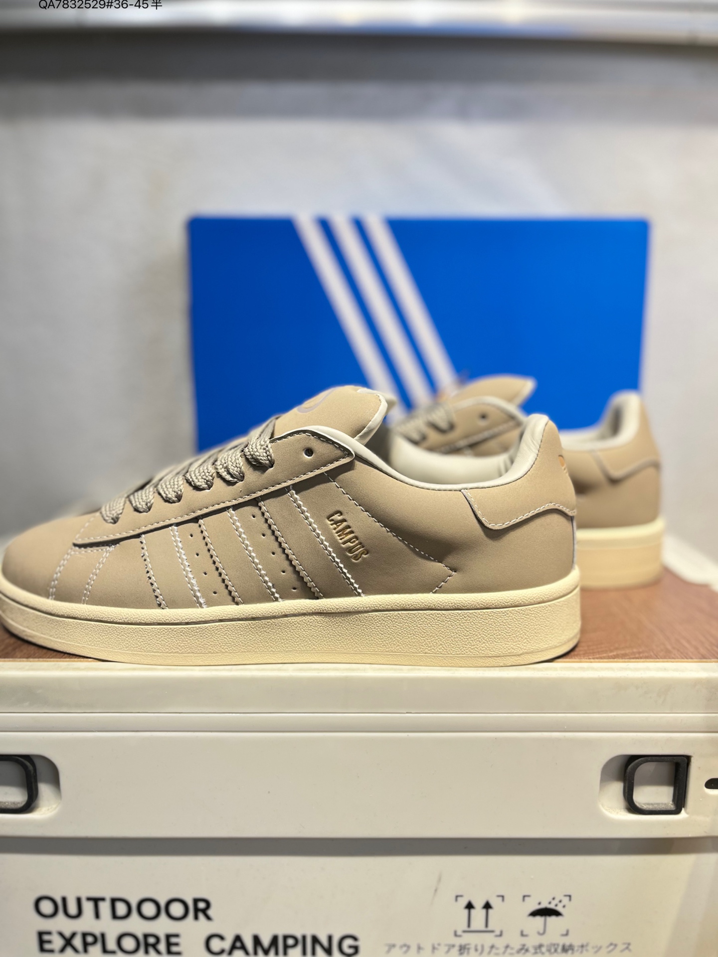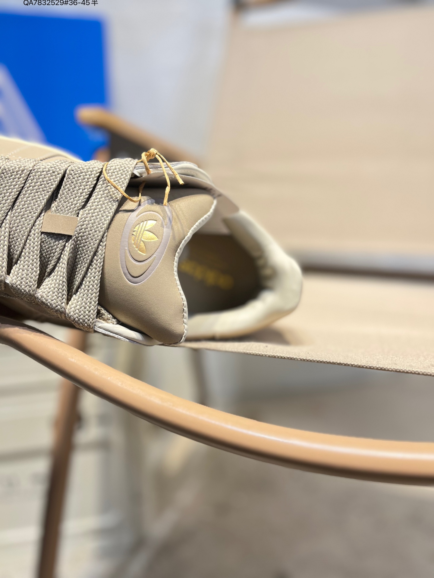 - 標誌性輪廓與細節:這款鞋復刻了 Campus 系列經典低幫輪廓,並融入千禧年滑板鞋的飽滿設計,鞋身圓潤飽滿,完美契合 “麵包鞋” 的視覺特徵。鞋身側面是辨識度極高的鋸齒狀三條紋,鞋舌和鞋跟處分別點綴三葉草標誌,既呼應系列經典元素,又強化了品牌辨識度,整體復古氛圍拉滿。