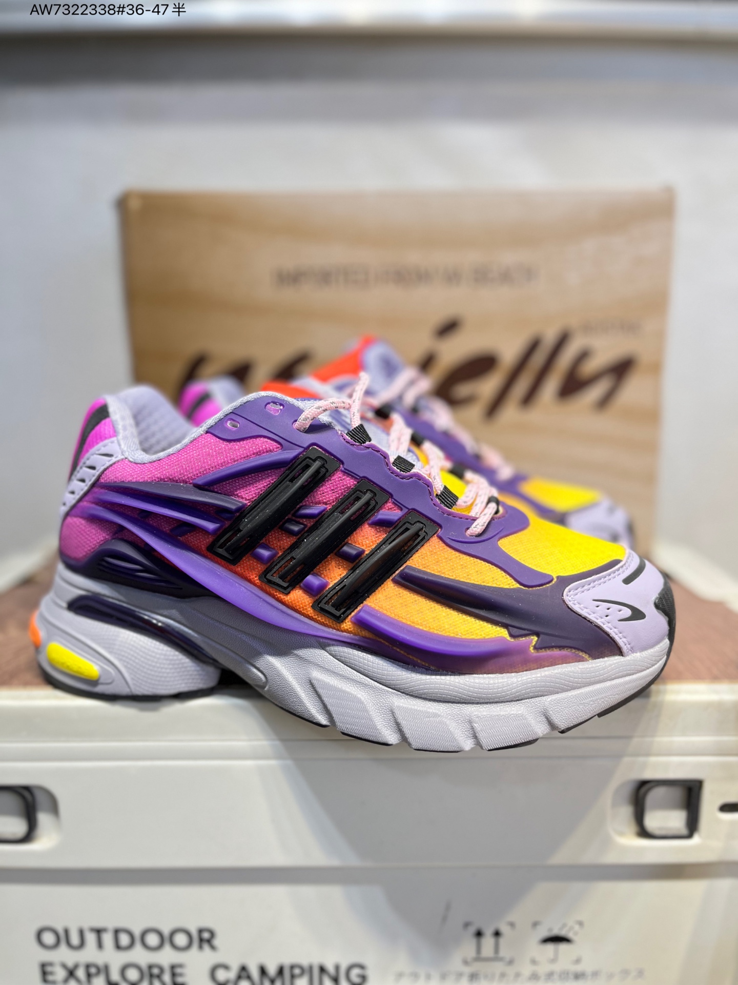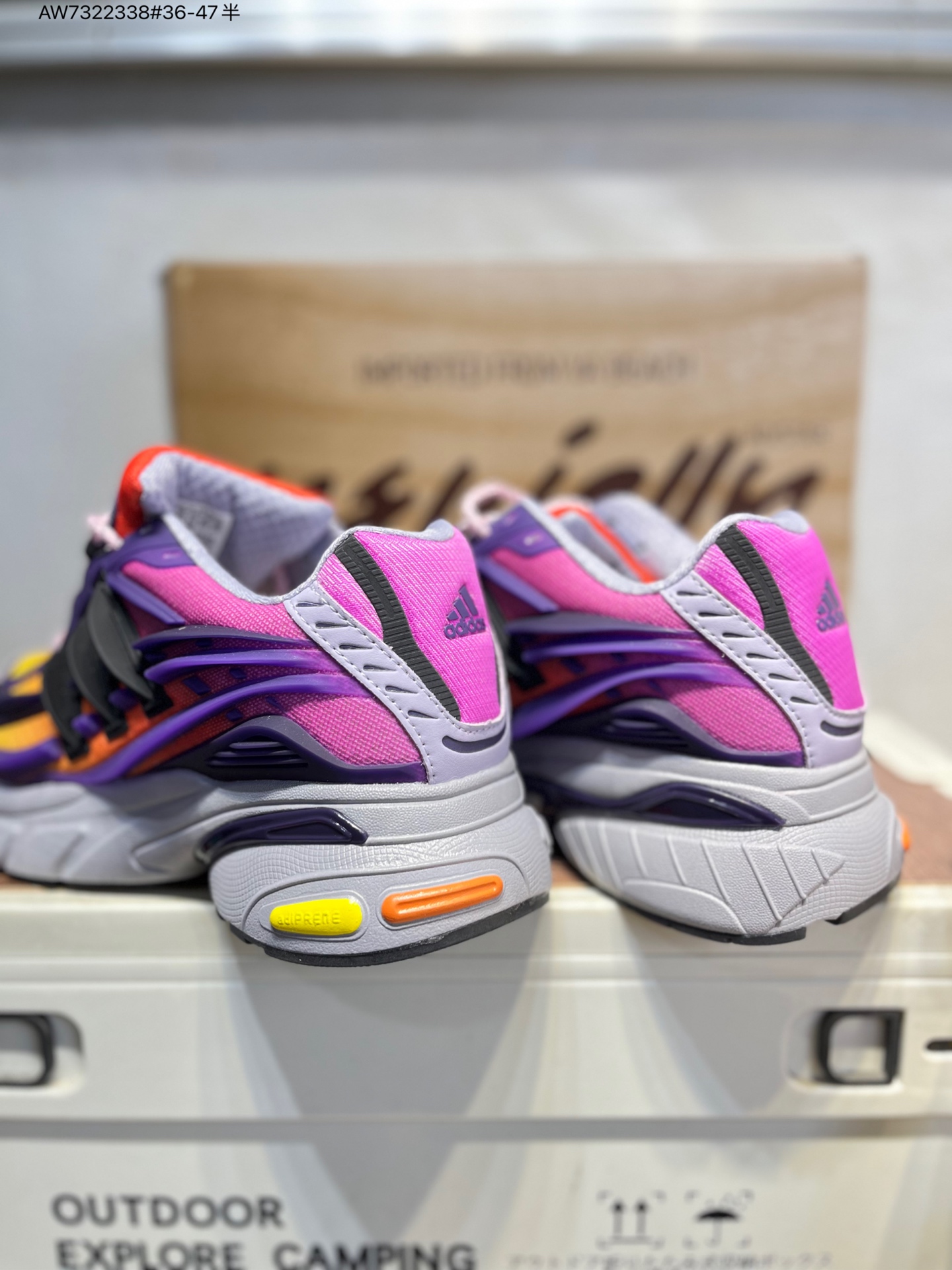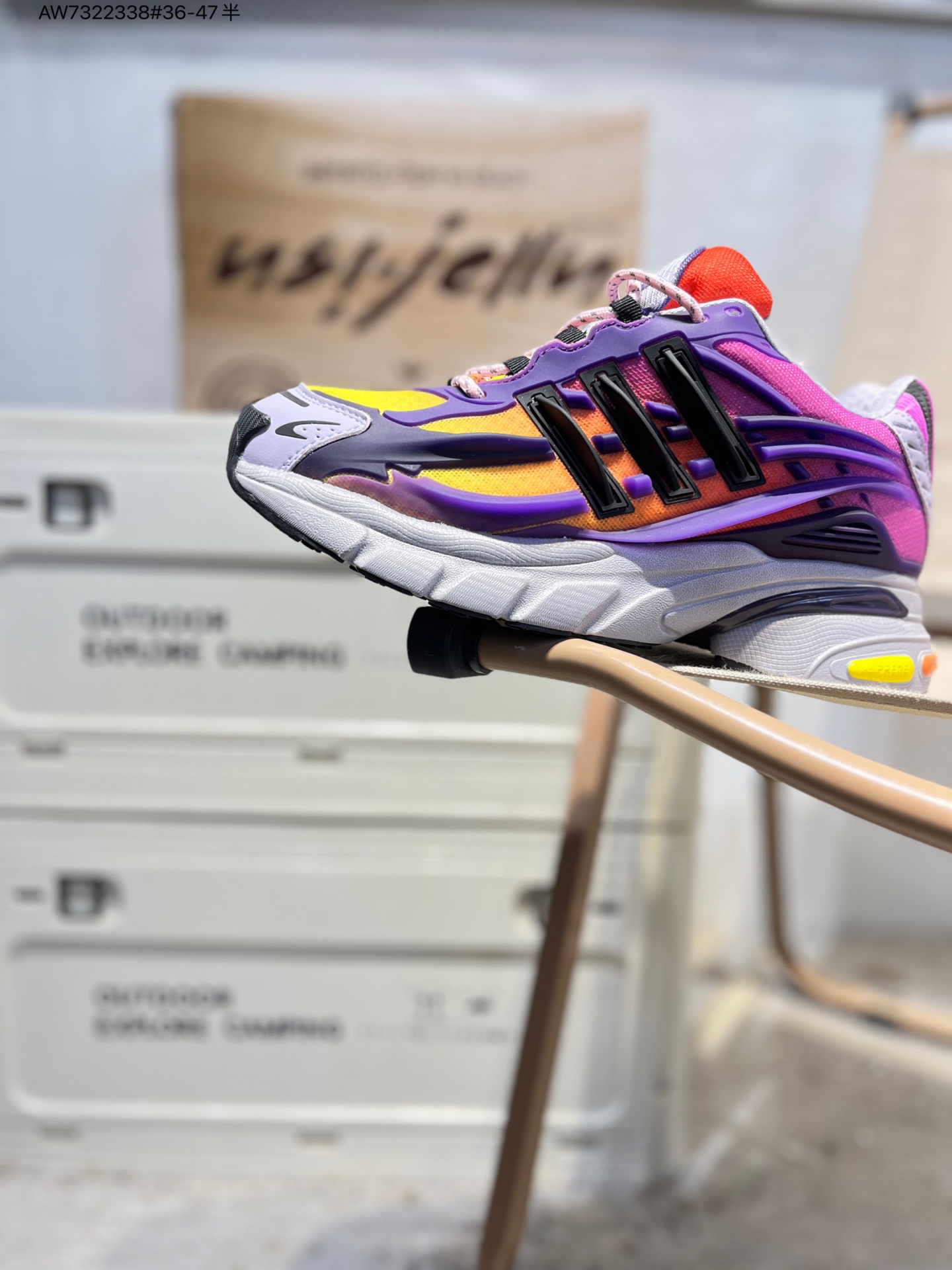 :鞋面采用网布与皮革拼接,网布区域负责透气,皮革模块为关键部位提供防护。经典三条纹化作立体凸起的 “铠甲片” 嵌进鞋身,鞋舌上有 “Jellyfish” 标识和 “Virginia” 字样,后跟处有 adidas 经典 Logo 与橙白拼接的鞋提。