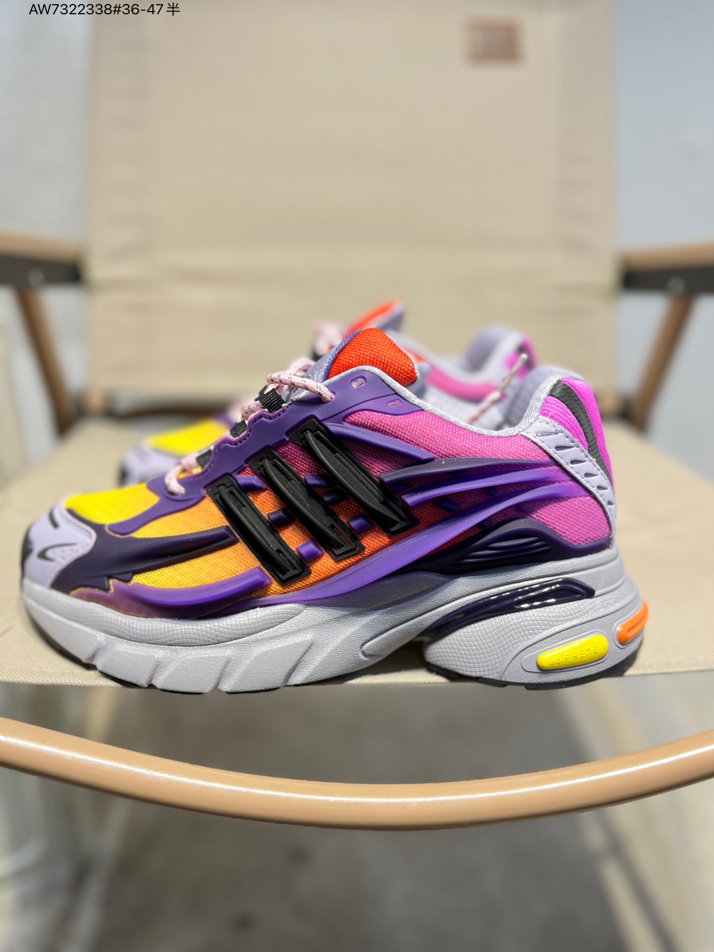 :设计灵感源自经典跑鞋 Adistar Cushion 3,同时融入了 “水母” 这一独特的生物形态概念。菲董运用 3D 打印 TPU 层在鞋面构建起立体的 “外骨骼” 框架,模拟水母漂浮时的流动感,外底结构通过层叠式面板和雕塑感元素,捕捉水母形态所蕴含的肌肉运动与流动能量感。